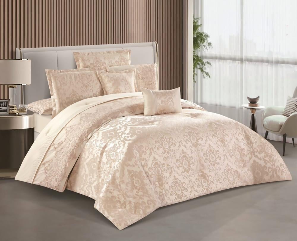 أضـف رفـاهـيـة الـفـخـامـة إلـى غـرفـة نـومـك في ليلة العمر مـع طـقـم لـحـاف ROYAL الـفـاخـر بـخـامـتـه الـجـاكـار الـنـاعـمـة, وبـتـصـمـيـم الـزخـرفـة الـشـانـيـل مـع لـمـسـة نـهـائـيـة فـي الأطـراف تـضـفـي الأنـاقـة بـنـمـط عـصـري وتعطي شعور الراحة والاطمئنان بالوانه الناعمة .